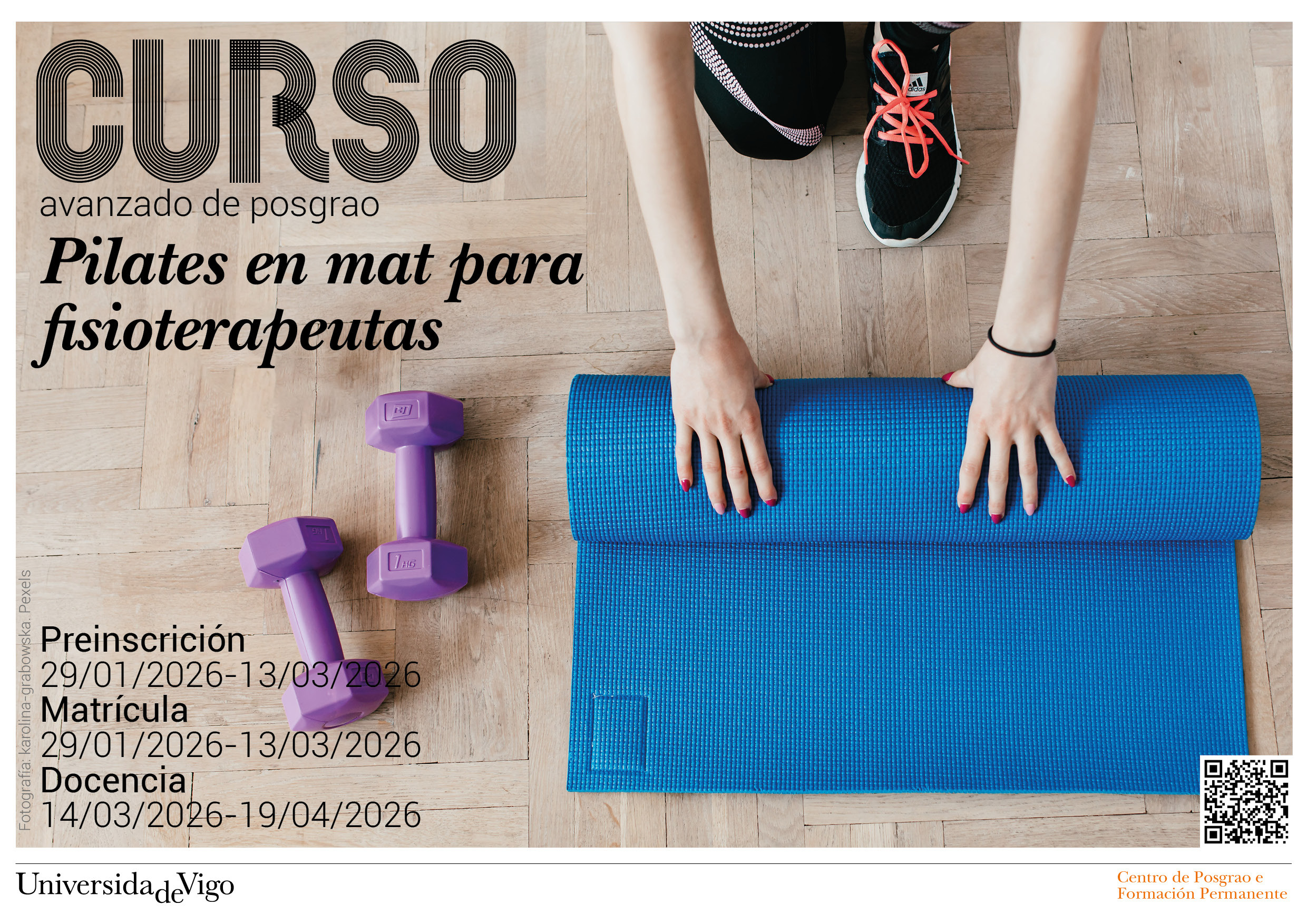 O Curso Avanzado de Posgrao “Pilates en mat para fisioterapeutas” é unha formación que trata de dar resposta ao interese de estudantes e profesionais de Fisioterapia de acadar unha boa base de coñecementos sobre a aplicación método Pilates no eido clínico asistencial.