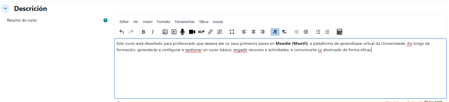 Engadir un resumo á portada do curso é unha boa práctica para personalizar o espazo virtual. Recoméndase engadir unha descrición breve pero informativa. Tamén permite engadir unha imaxe do curso.