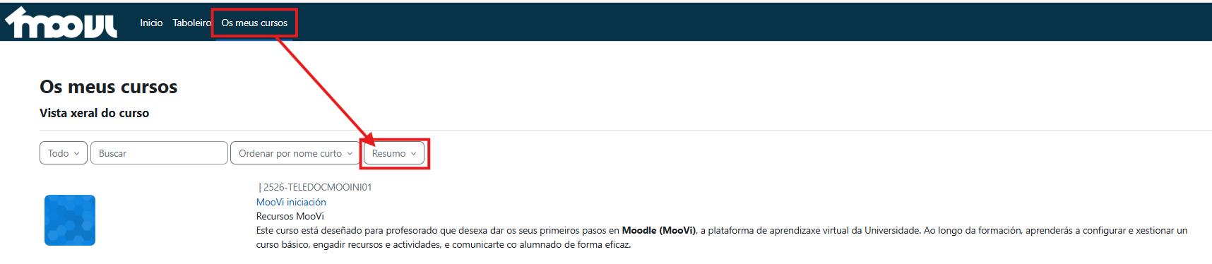 Ese resumo, ou a imaxe, amósase na páxina de inicio na listaxe de cursos dispoñibles e na sección «Os meus cursos» se filtran por "resumo":