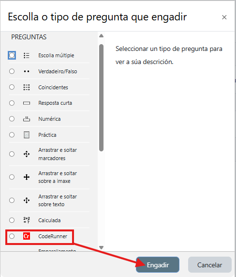 Escolle o tipo de pregunta «CodeRunner»: