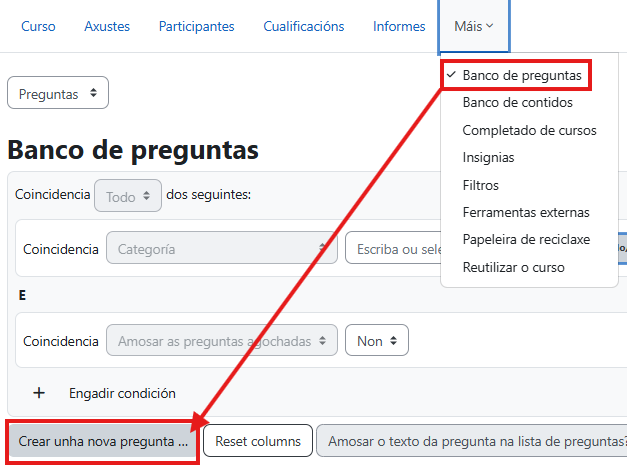 Para empregar a pregunta de tipo CodeRunner, vai ao banco de preguntas do teu curso e escolle "crear unha nova pregunta":