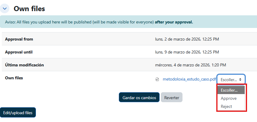 Cando está configurado para que o estudante aprobe a súa publicación, despois de subir o ficheiro aparece un despregable no que pode aprobar ou rexeitar a súa publicación: