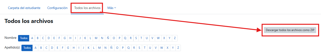 O profesorado pode subir ficheiros a este cartafol, cambiar o estado de aprobación dos ficheiros entregados e descargar todos os ficheiros nun zip:
