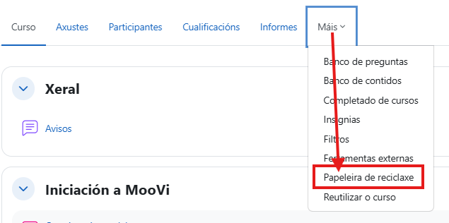 Se eliminaches algún recurso ou actividade do teu curso, podes recuperalo desde a papeleira de reciclaxe (os contidos da papeleira bórranse de xeito definitivo despois de 7 días):
